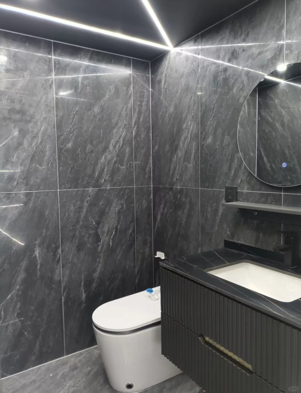 Das Luxusbad beeindruckt mit 8 mm Glasdusche, edlen Marmordetails, Markenarmaturen und einem 4-in-1-Badmodul mit Licht, Lüftung, Heizung und Trocknung.